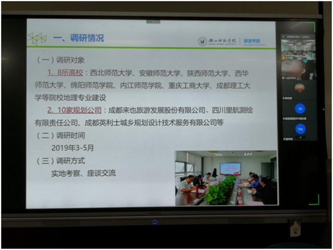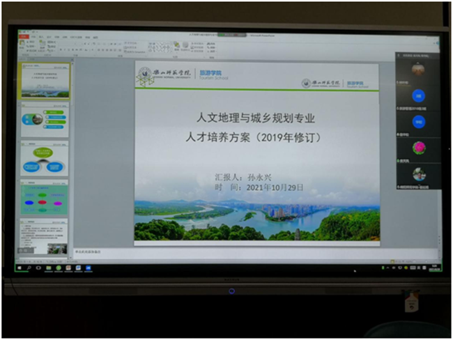本网讯(文、图/孙永兴)2021年10月29日,由云南师范大学研究生处处长、博士生导师、骆华松教授任组长,来自西华师范大学地理科学学院副院长林叶斌副教授、绵阳师范学院资源环境工程学院院长董廷旭教授、内江师范学院地理与资源科学学院院长袁天凤教授、乐山市自然资源局秦天彬主任组成专家评审组,以在线会议形式对乐山师范学院旅游学院的《人文地理与城乡规划专业本科人才培养方案(2019年修订)》(以下简称《培养方案》)进行评审。旅游学院院长郭剑英、副院长但强、四川旅游发展研究中心主任郑元同、院长助理孙永兴参加了本次评审会议。