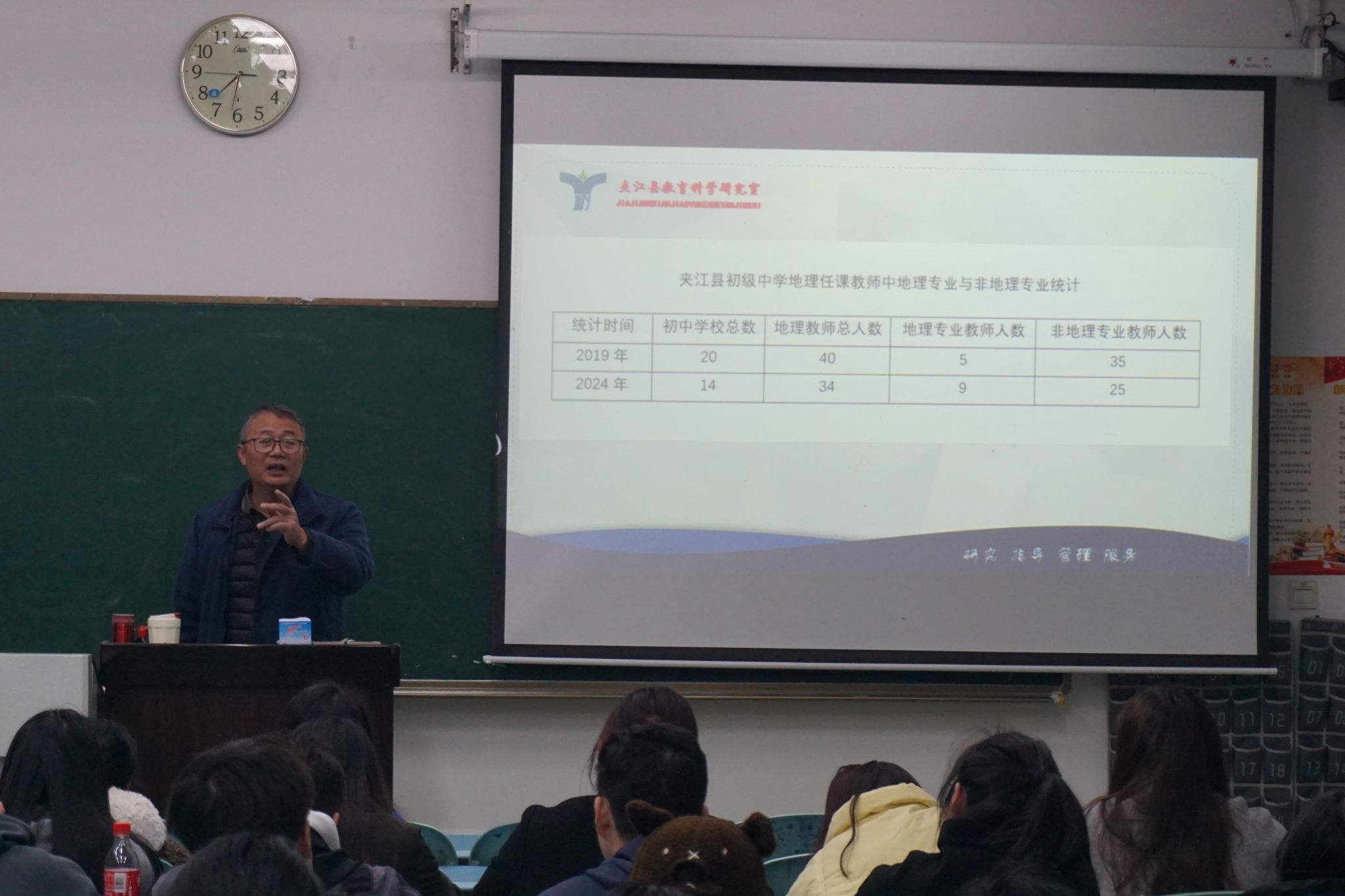 本网讯(文/王小龙、图/陈佳炫)11月18日晚,旅游与地理科学学院特邀夹江县教研室地理教研员王向斌老师于行知楼115教室为22级地理科学专业学生作了以“县域中学地理教师队伍现状”为主题的讲座。