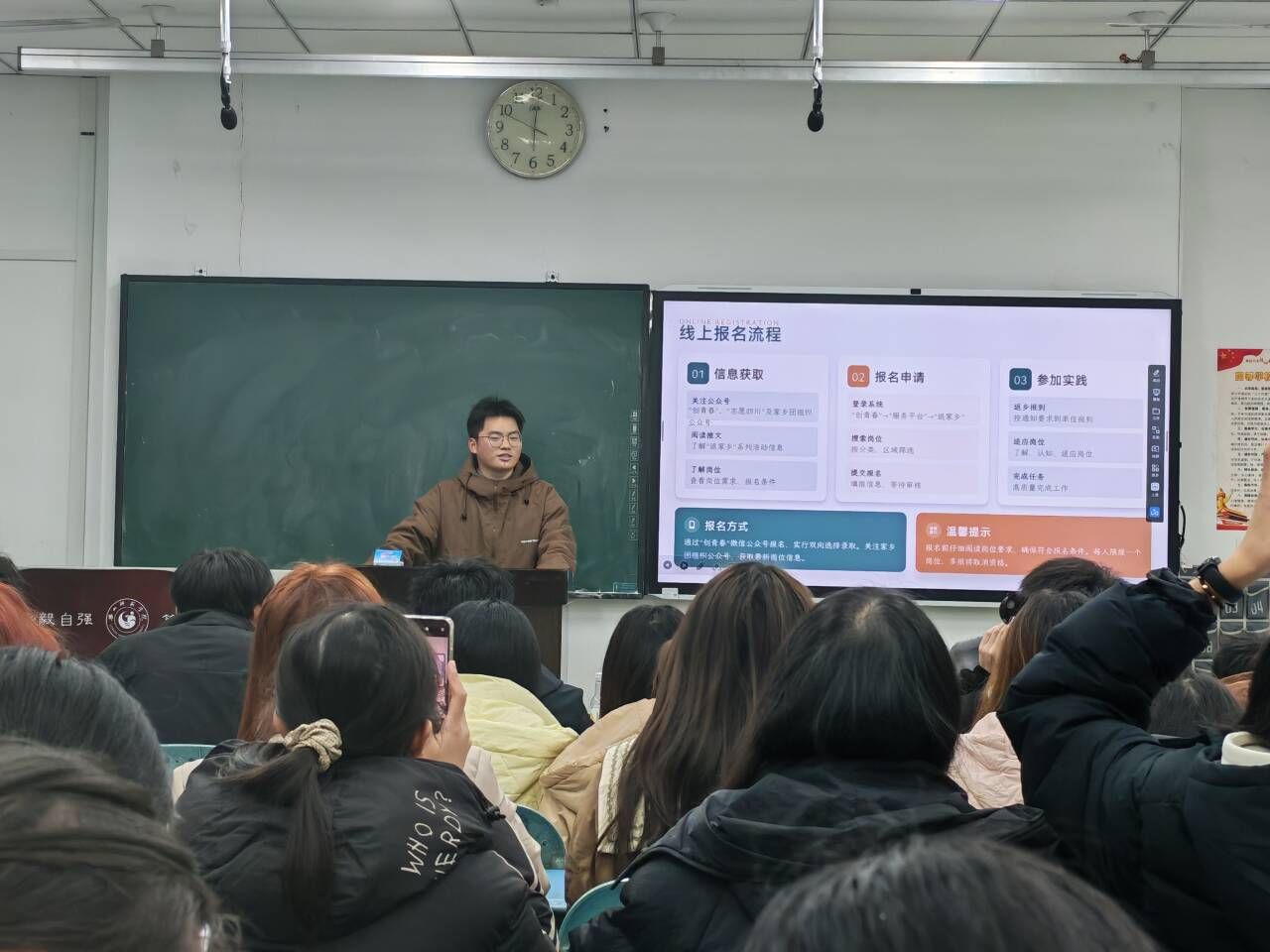 此次宣讲活动不仅为新生参与寒假社会实践搭建了清晰的指引桥梁,更深化了大家对 “奉献、友爱、互助、进步” 志愿服务精神的认知,有效激发了主动参与实践、锤炼综合素质的积极性。后续,院青志分中心将持续跟进寒假社会实践全流程工作,助力学子在实践中践行青年担当、提升专业能力,切实将实践育人成效落到实处。