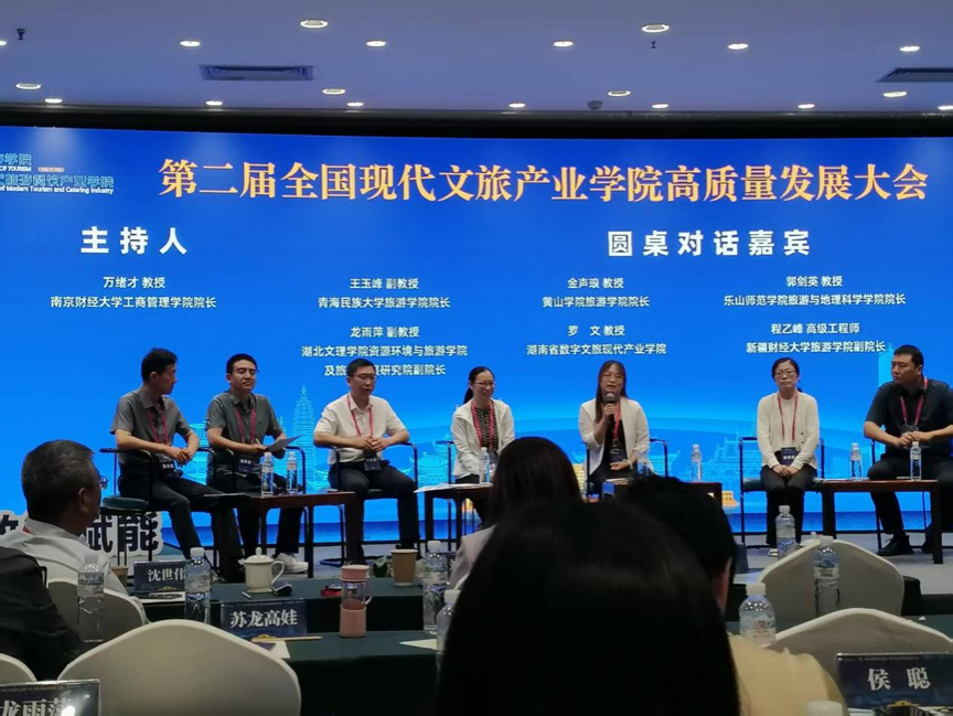 大会涵盖开幕式、主旨演讲、圆桌论坛、闭幕式及昆明学院现代产业学院考察等多个环节。郭剑英参与了圆桌对话2,主题为“现代文旅产业学院服务区域经济发展的路径与成效”。该环节由南京财经大学工商管理学院院长万绪才主持,对话嘉宾包括青海民族大学旅游学院院长王玉峰、黄山学院旅游学院院长金声琅、乐山师范学院旅游与地理科学学院院长郭剑英、河北经贸大学旅游学院副院长侯聪、湖北文理学院资源环境与旅游学院副院长龙雨萍、新疆财经大学旅游学院副院长程乙峰以及讯狐国际科技(北京)有限公司董事长吴峰。对话聚焦于文旅产业学院的发展困境与破局路径,强调应以区域经济需求为导向,通过深化产教融合、明确各方权责、构建互利生态,推动高校与企业从“松散合作”向“共生共融”转型。