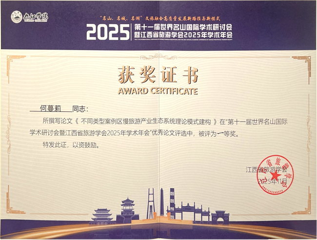 本网讯(文、图/乔恒忠)11月14日至16日,由九江学院、黄山学院、泰山学院、乐山师范学院、衢州学院与江西省旅游学会等联合主办的“第十一届世界名山国际学术研讨会暨江西省旅游学会2025年学术年会”在江西九江召开。学校党委常委、副校长江滔,旅游与地理科学学院副院长乔恒忠,旅游管理专业教师谭琪博士,四川旅游发展研究中心何蔓莉博士受邀参会。何蔓莉博士作分论坛学术报告,参会论文在本次会议优秀论文评选中被评为一等奖。