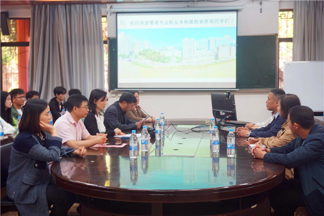 本网讯(文/苏杰,图/苏杰,张雯)根据《四川省教育厅关于开展2022年本科层次职业教育人才培养试点工作的通知》要求,乐山师范学院与四川工程职业技术学院、四川省旅游投资集团有限责任公司联合开展了本科层次职业教育人才培养改革试点项目,职教本科班46名同学已从2022年9月起在四川工程职业技术学院报到并开始了学习。4月27日,职教本科班46名同学由四川工程职业技术学院旅游管理系党总支书记余立勤带队,在旅游管理系党政办副主任于浣等5名老师的具体组织下来到我校参观交流。我校旅游与地理科学学院党委书记徐秀云、副院长孙永兴、党委副书记冉勇和学生管理科科长江纳等热情接待了余立勤一行。