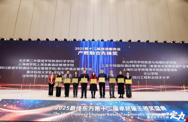 论坛期间举行“旅游服务业2025卓越雇主颁奖盛典”,大会对在行业发展与人才培养中作出卓越贡献的标杆企业、优秀院校予以表彰。我校旅游与地理科学学院凭借在产教融合领域的深耕细作,在众多参会单位中脱颖而出,荣获“产教融合先锋奖”。这份荣誉,是对学院近年来在人才培养模式创新、校企合作深度拓展、服务产业发展能力提升等方面不懈努力的高度认可,更是鞭策。未来,旅游与地理科学学院将以此次论坛为契机,以“产教融合先锋奖”为动力,持续深化校企合作、拓展产学研协同路径。让教育教学更贴近产业实际,让人才培养更契合市场需求,努力培养更多兼具专业素养、创新精神与实践能力的文旅高素质技术技能人才。